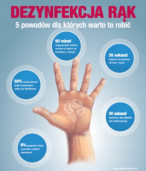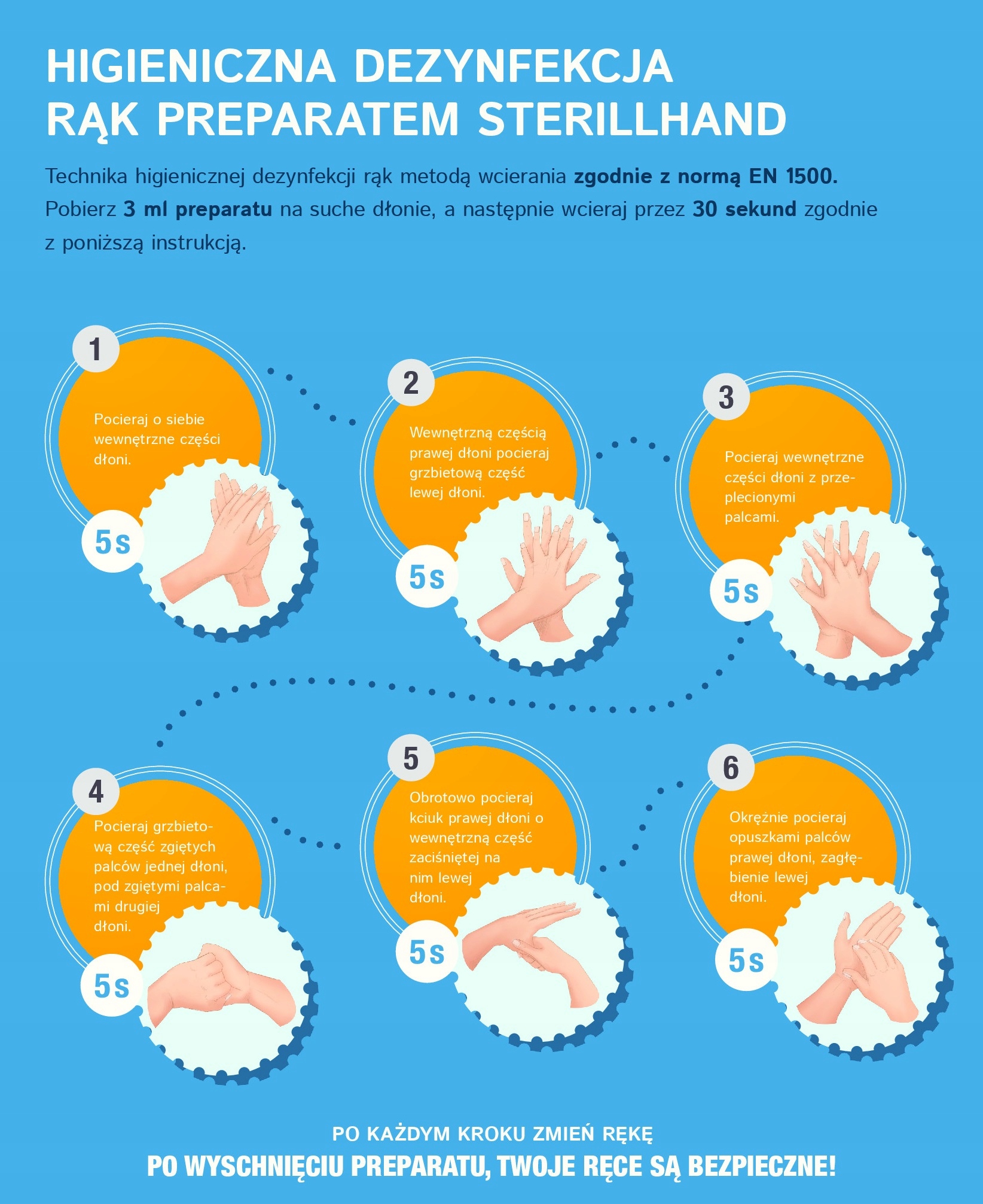 Higieniczna dezynfekcja rąk: Płyn do dezynfekcji Sterillhand wcierać w skórę rąk w czasie30 sek.