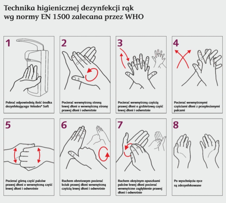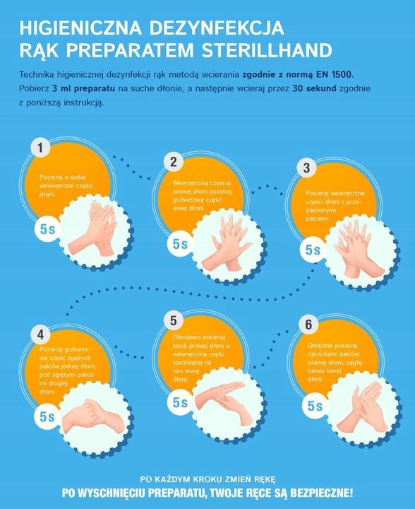 ☝️ Higieniczna dezynfekcja rąk – na czyste i osuszone dłonie nanieść 3 ml preparatu, wcierać przez 30 sekund, zwracając uwagę na przestrzenie między palcami oraz okolice paznokci.