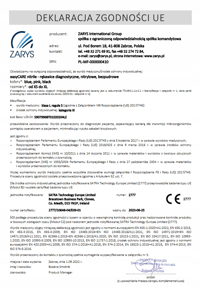 Wyżej wymieniony wyrób medyczny spełnia wszystkie stosowalne wymogi załącznika I Rozporządzenia PE i Rady (UE) 2017/745.